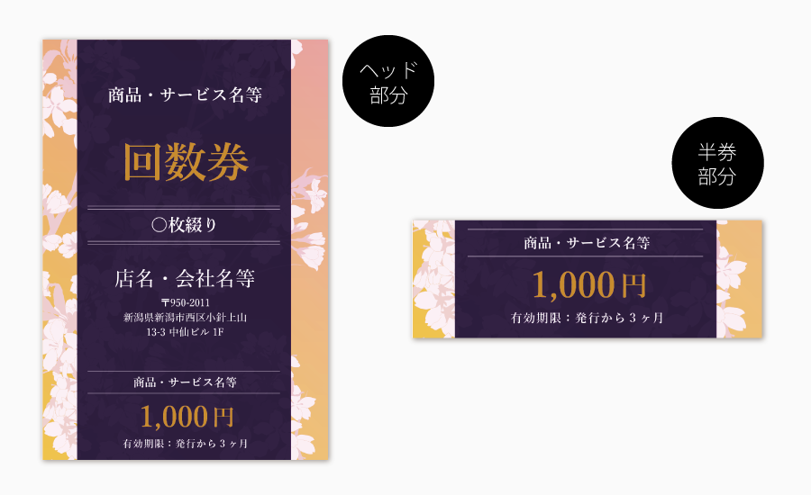 回数券・コーヒー券などタイトルや、金額部分も含めて全ての表示はお好きなテキストに書き換え可能、例えば「ヘッドスパ券」「100ポイント」などオリジナル表記に変更可能です。